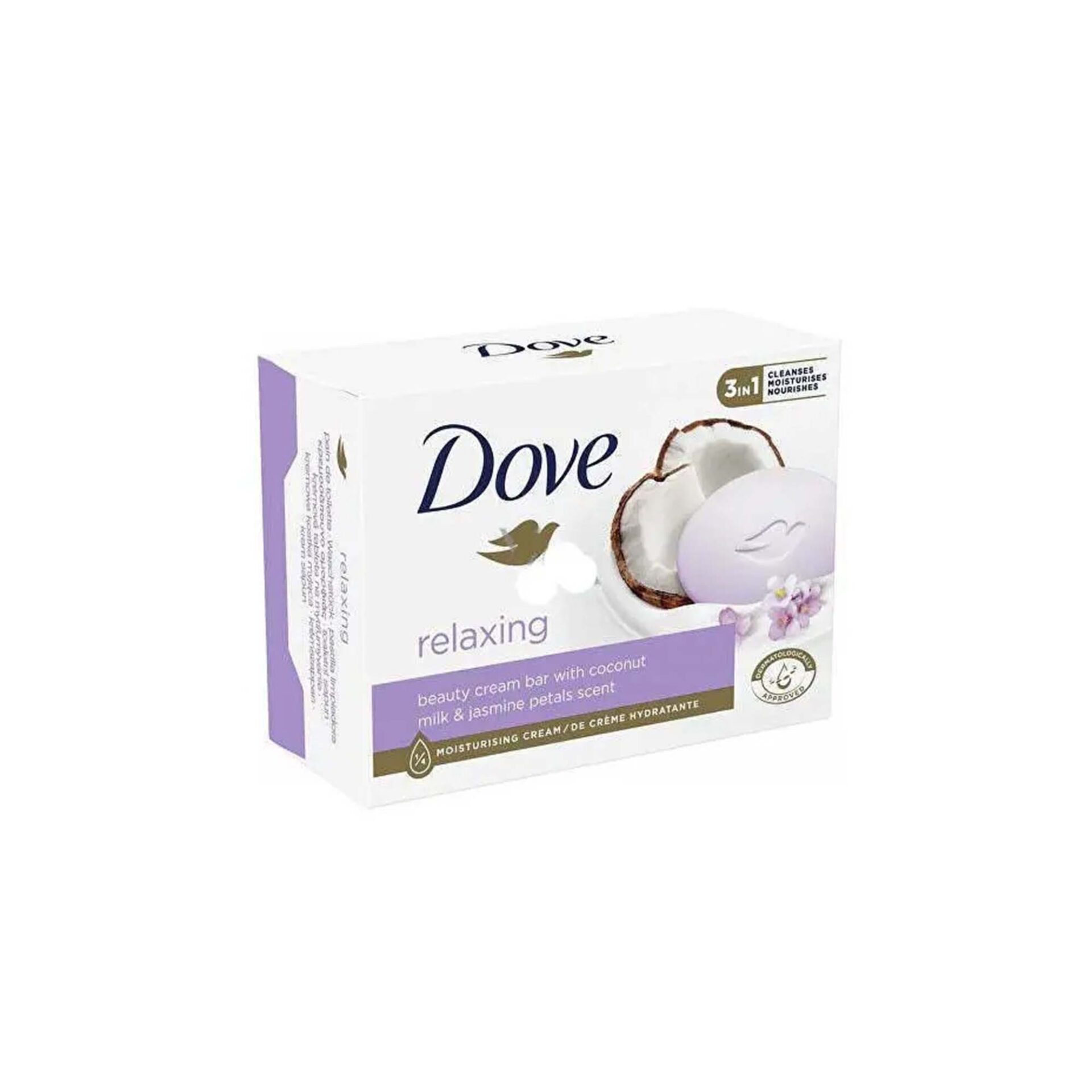 The Dove Relaxing Beauty Cream Bar with Coconut Milk and Jasmine Petals is a moisturizing beauty bar, not a traditional soap, that gently cleanses and nourishes the skin, leaving it soft, smooth, and delicately scented. The product you specified is a pack containing 4 bars, each weighing 90g, for a total of 360g.