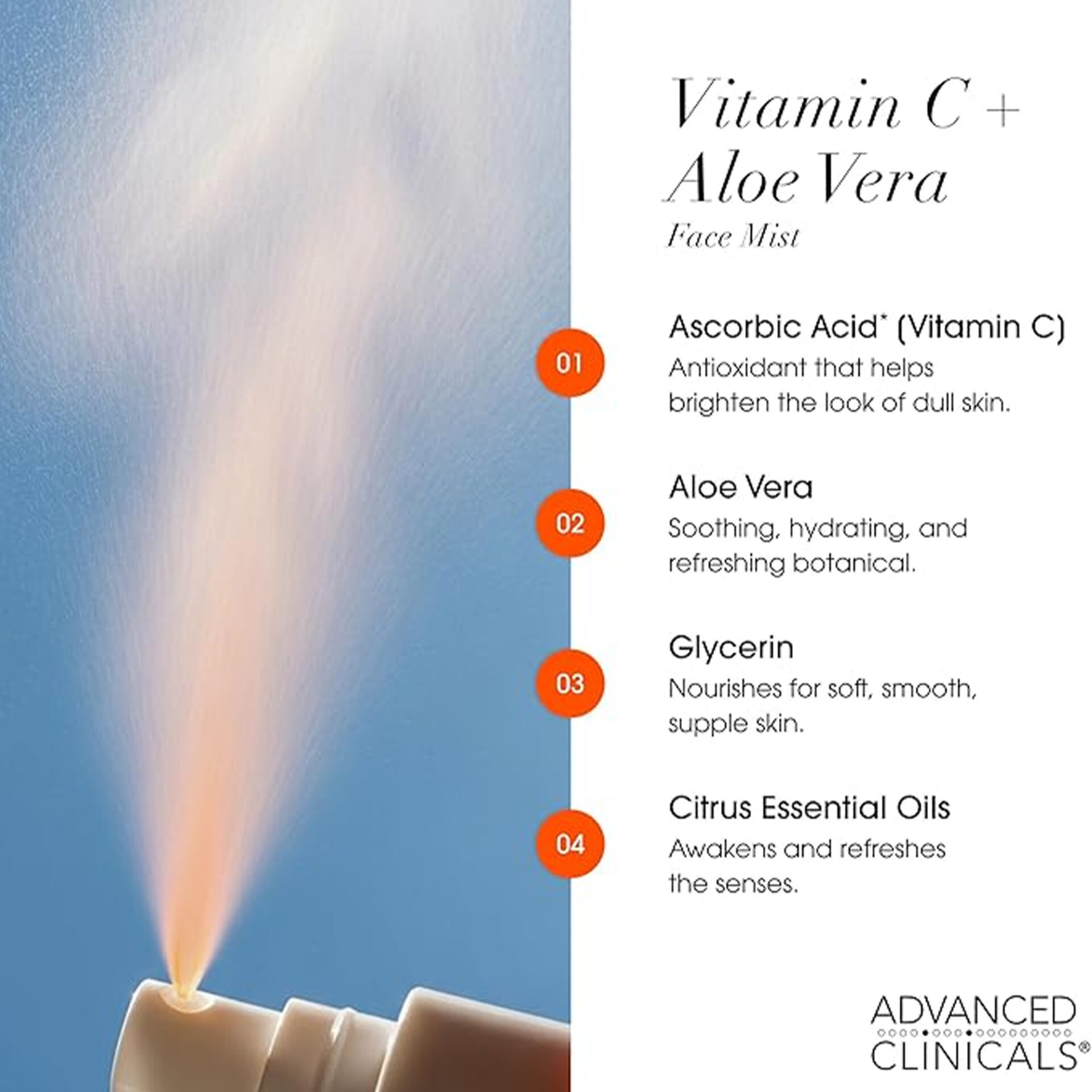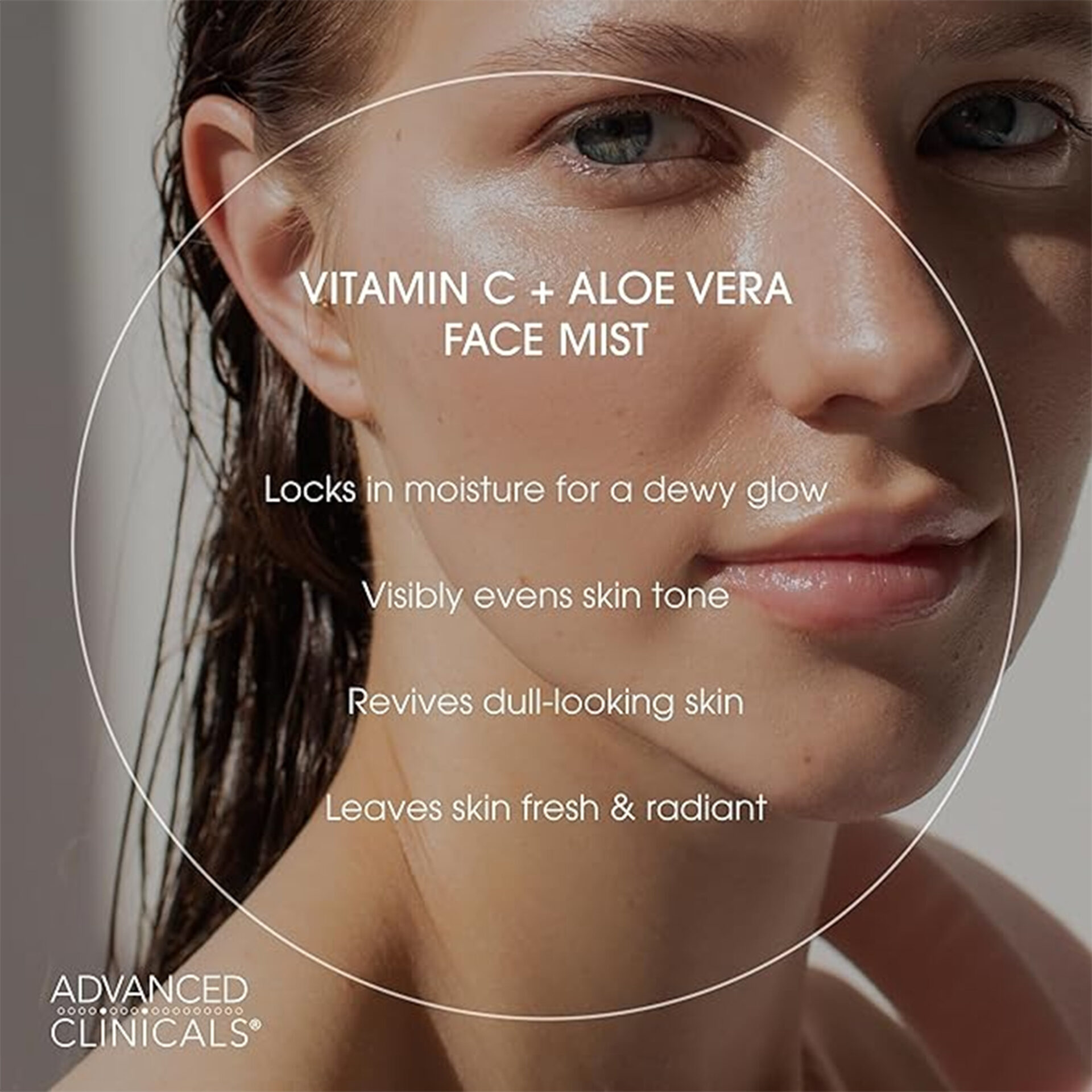 Refresh and brighten your skincare routine with Advanced Clinicals Vitamin C & Aloe Vera Face Mist. This fast-absorbing 222 ml antioxidant-rich mist instantly boosts skin hydration by up to 88%, thanks to its blend of stabilized Vitamin C and soothing aloe vera