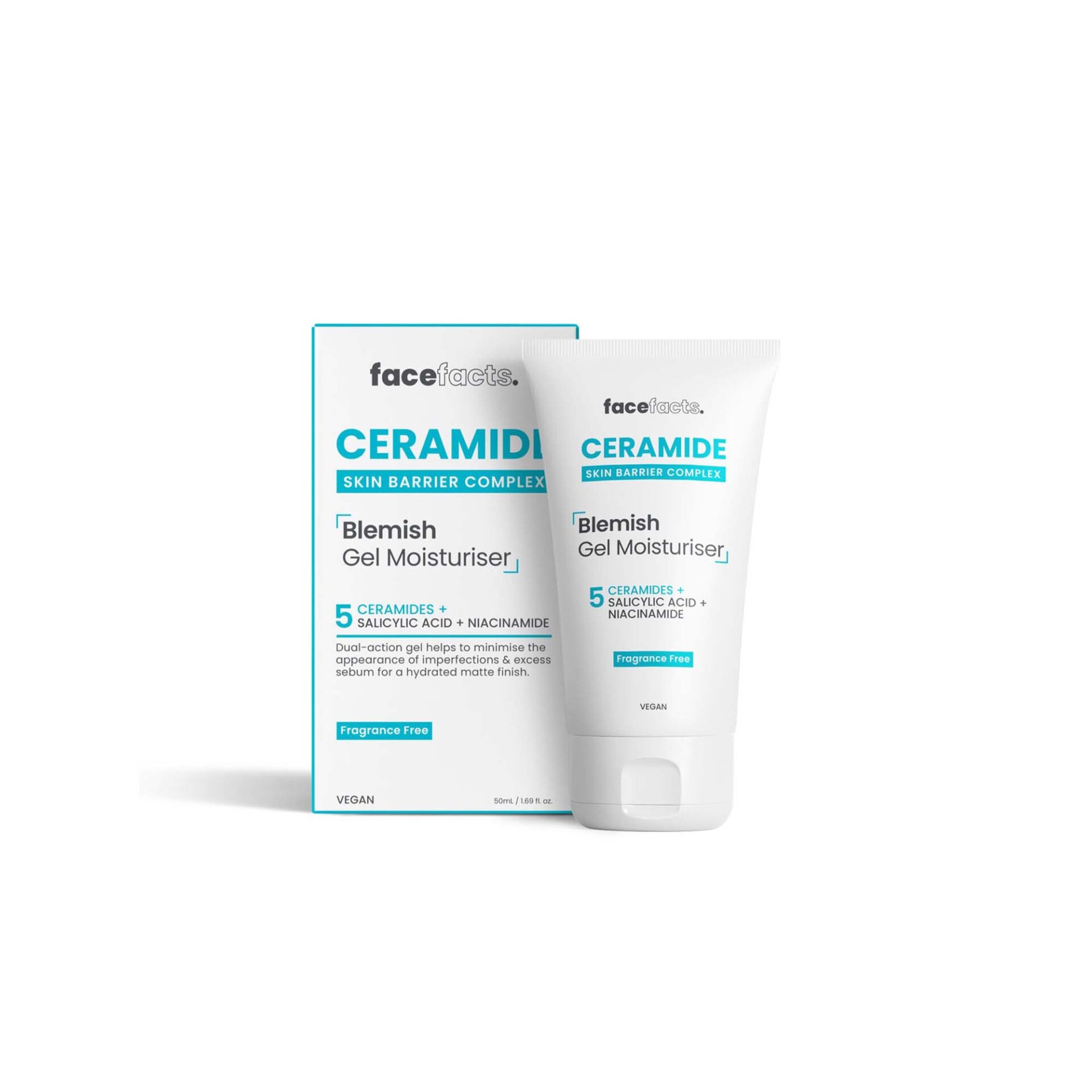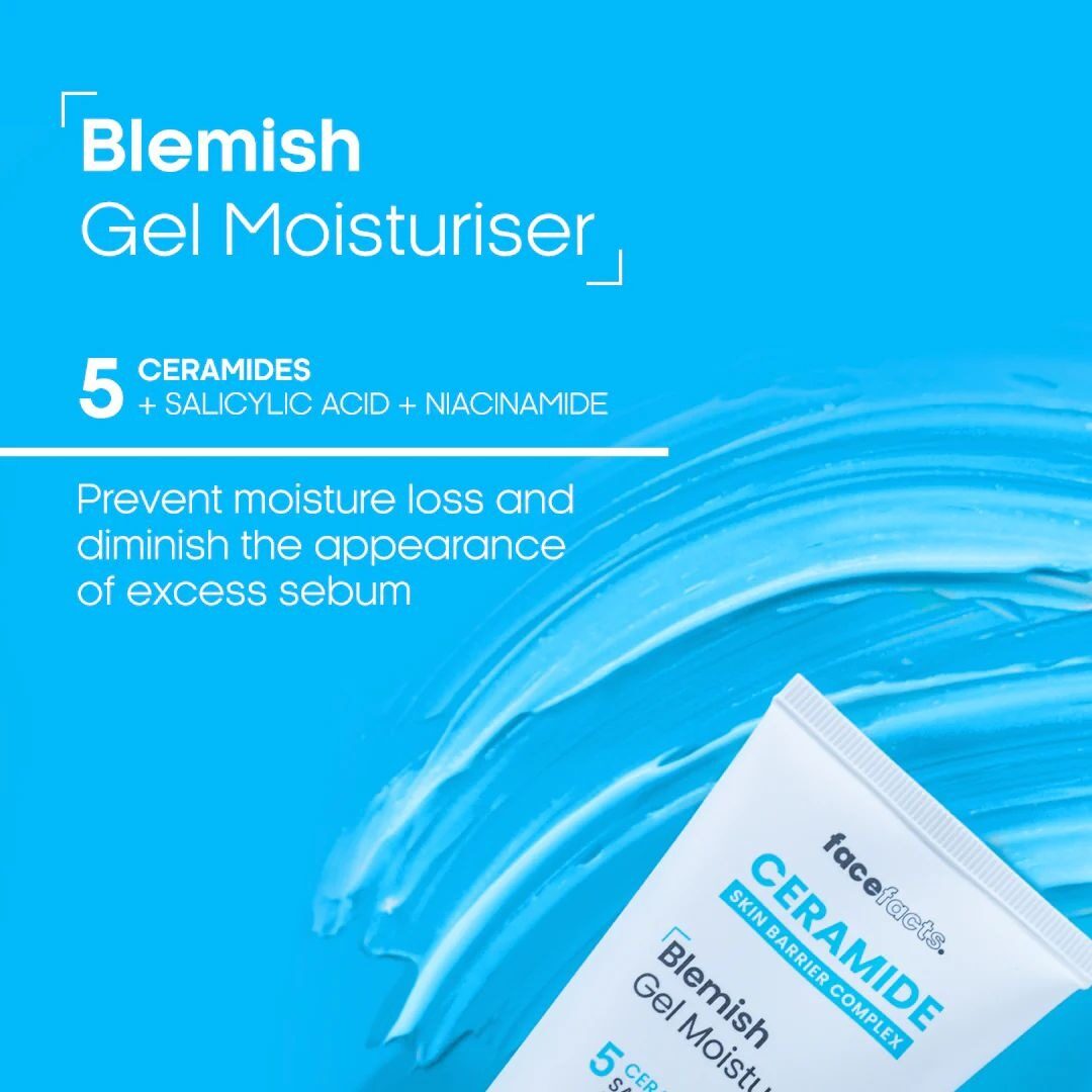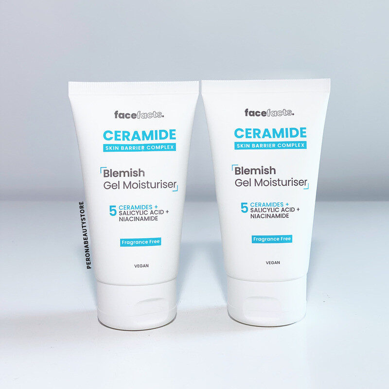 The Face Facts Ceramide Blemish Gel Moisturiser 50ml is a lightweight, fragrance-free, and vegan-friendly face cream designed for oily, combination, and acne-prone skin. It combines a complex of 5 ceramides, salicylic acid, and niacinamide to hydrate the skin while targeting blemishes and excess oil.