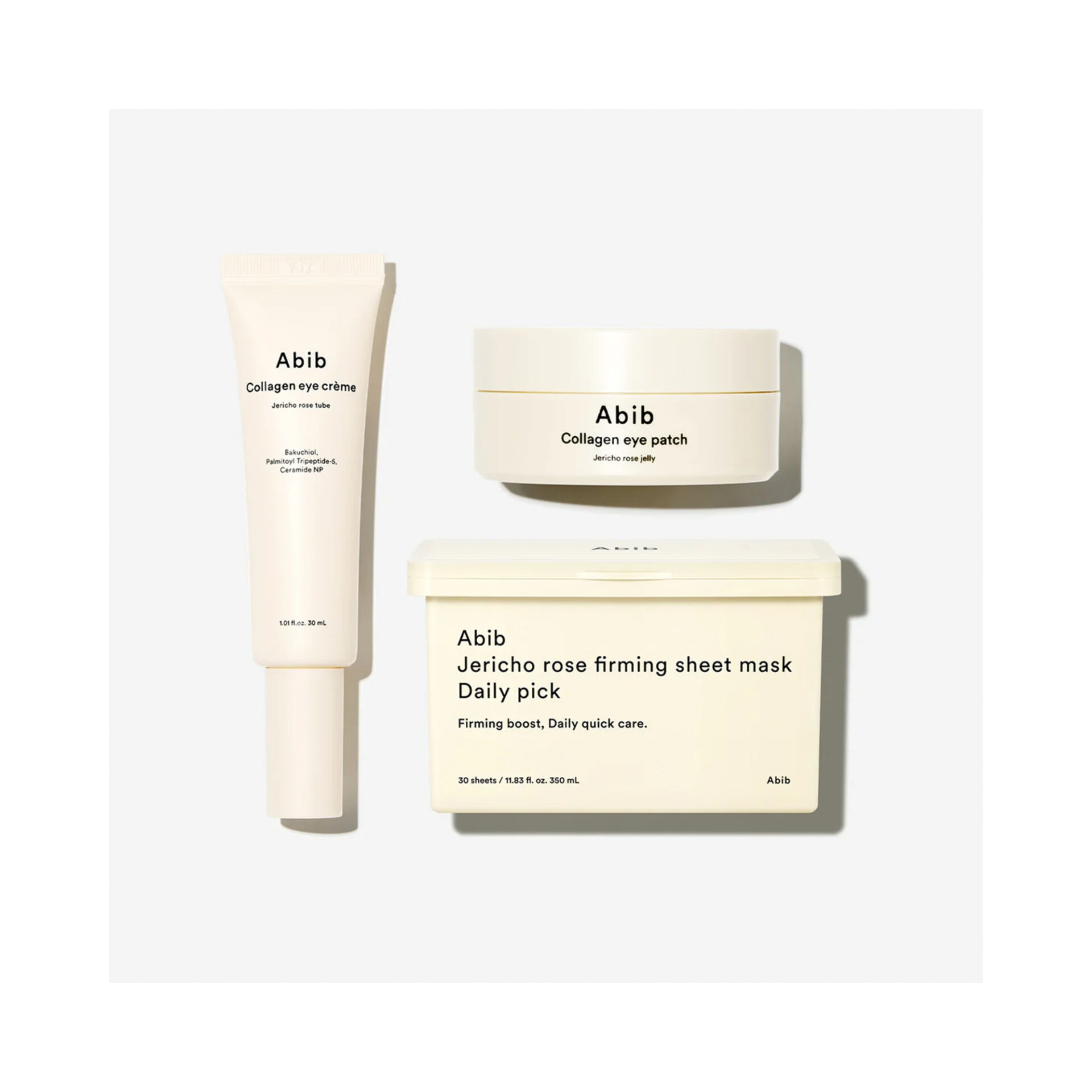 This trio includes Collagen Eye Patches (60 pcs / 90 mL / 3.04 fl. oz), Collagen Eye Crème (30 mL), and a Daily Elasticity Mask infused with 350 mL (11.83 fl. oz) of essence, delivering concentrated anti-aging care to the eye area and entire face.